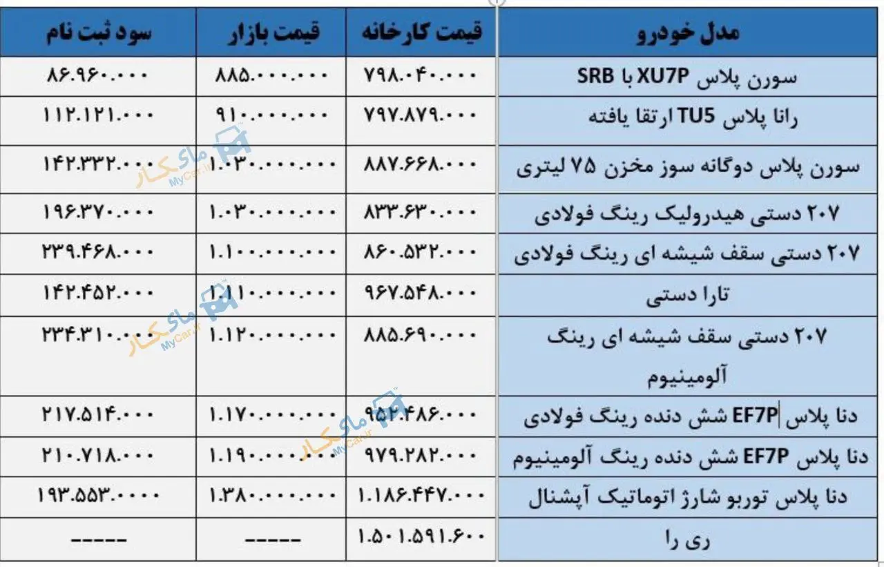 در بین خودروهای قابل عرضه ، دو مدل ۲۰۷ پانوراما با حدود ۲۳۴ میلیون تومان برای رینگ آلومینیومی و ۲۳۹ میلیون تومان برای رینگ فولادی بیشترین سود را دارد