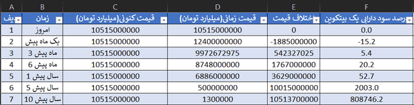 در این تحلیل، قیمت فعلی بیتکوین ۱۰ میلیارد و ۵۱۵ میلیون تومان در نظر گرفته شده است و بازدهی دورههای مختلف نسبت به این قیمت مبنا محاسبه شده است.
